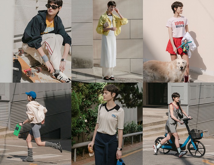 스포티한 감성이 돋보이는 집업 베스트-스커트 셋업부터, 경쾌하면서도 라이트한 컬러감이 더해진 티셔츠, 윈드 브레이커, 가볍고 캐주얼한 무드의 원피스 등 봄과 곧 다가올 여름 데일리하게 착용하기 좋은 아이템들로 다채롭게 구성되어 있다.
