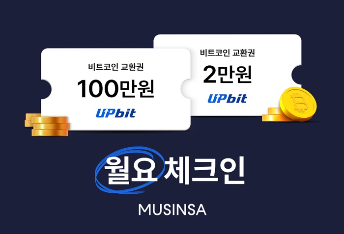 무신사는 업비트와 함께 오는 28일 월요 체크인 이벤트에서 총 20억 원 상당의 비트코인 교환권을 경품으로 제공한다. ‘월요 체크인’은 무신사 회원 누구나 참여할 수 있는 선착순 경품 추첨 이벤트다.