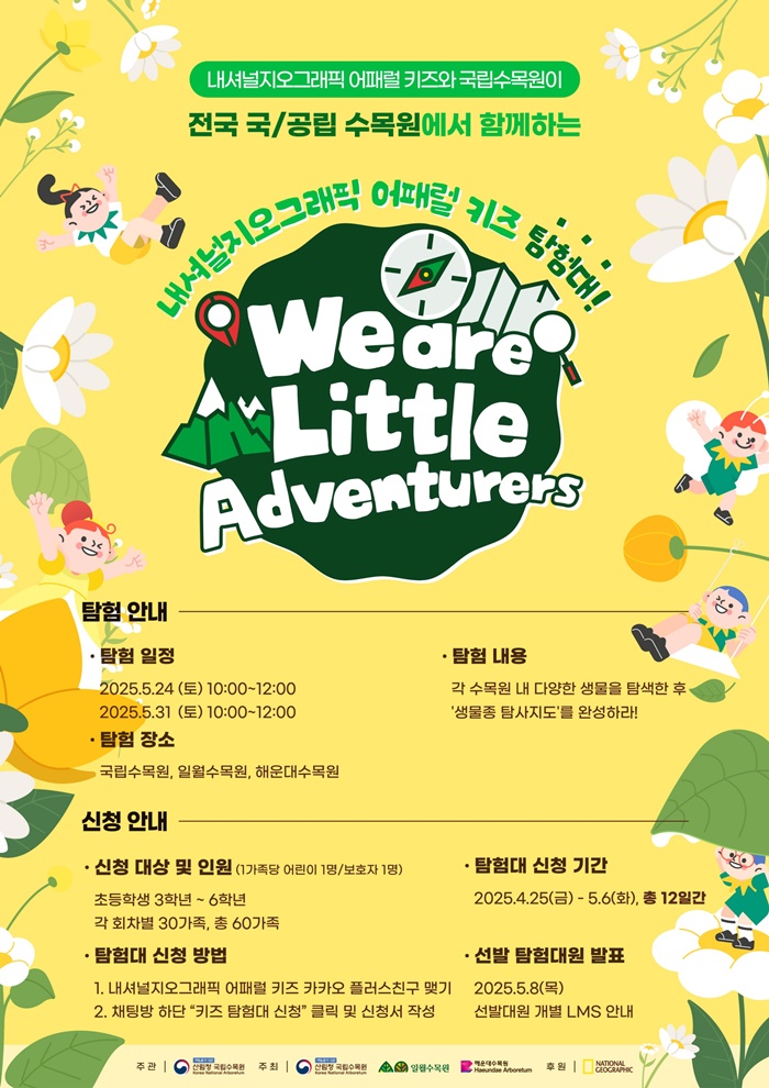참가 접수는 4월 25일~5월 6일 총 12일간 진행한다. 신청 방법은 ‘내셔널지오그래픽 어패럴 키즈’ 카카오 플러스 친구를 맺은 후 채팅방 하단의 ‘키즈 탐험대 신청’을 클릭, 참가 신청서를 작성해 제출하면 된다. 참가 신청자는 원하는 수목원과 행사 일정을 직접 선택해 신청할 수 있다. 최종 선발 탐험대원은 5월 8일 개별 안내 예정이다.