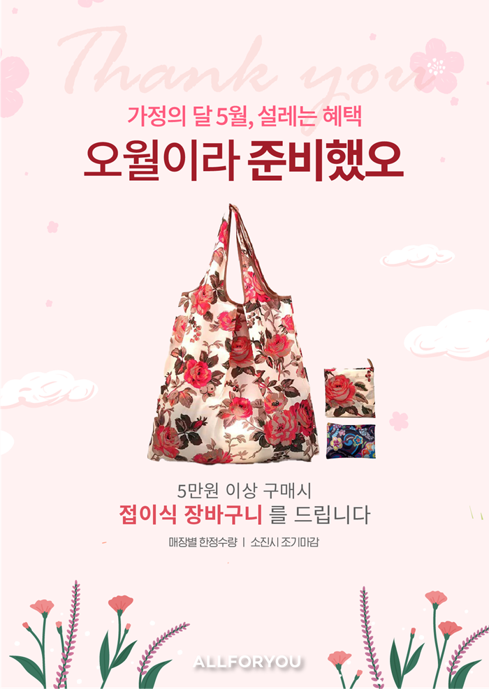 이번 프로모션은 4월 30일부터 재고 소진 시까지 올포유 전 매장에서 오프라인 구매 고객을 위한 행사로 실시한다. 프로모션을 통해 5만 원 이상 제품 구매 시 올포유에서 제작한 ‘접이식 장바구니’를 사은품으로 증정한다.