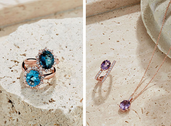르네 컬렉션은 청량한 블루 토파즈를 중심으로, 물결처럼 리드미컬하게 세팅된 화이트 스톤이 조화를 이루는 디자인이 특징이다. 우아한 균형미와 함께 정제된 아름다움이 돋보이며, 고급스러운 스타일을 추구하는 이들에게 주목받고 있다. 세브아 컬렉션은 보라빛 자수정이 꽃잎처럼 섬세하게 세팅된 디자인으로, 은은한 꽃향기를 떠오르게 하는 로맨틱한 무드를 자아낸다.