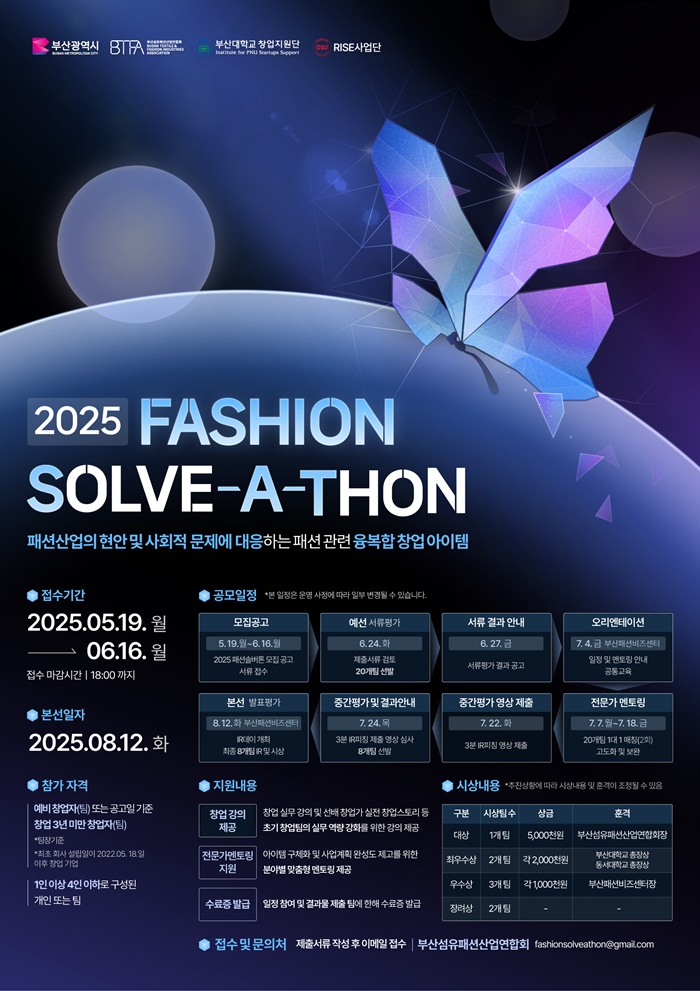 이번 ‘패션 솔버톤’은 부산광역시가 주최하고 부산섬유패션산업연합회가 주관하며 부산대학교 창업지원단, 동서대학교 RISE사업단과의 협업으로 운영된다. 의상 디자인 중심의 기존 패션 공모전들과 달리, ‘패션 솔버톤’은 패션산업의 현안 및 사회적 문제에 대응하는 융복합 창업 아이템 개발에 초점을 맞춘다. 참가자들은 환경(E)·사회(S)·거버넌스(G) 문제에 대응하는 창업 아이템, 패션산업의 경쟁력 강화를 위한 디지털 전환(DX) 창업 아이템 등 산업의 확장성을 확보하기 위한 융복합 솔루션을 제안해야 한다.