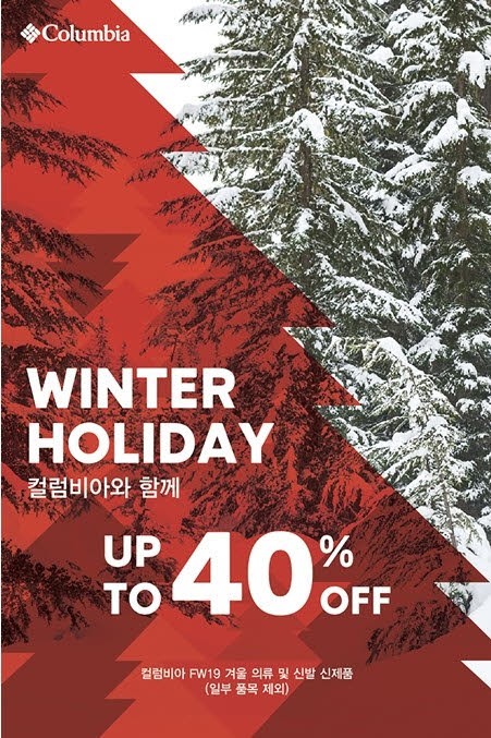 글로벌 아웃도어 스포츠 브랜드 ‘컬럼비아’는 19FW 시즌의 겨울 의류 및 방한화를 할인가에 판매하는 ‘윈터 홀리데이(Winter Holiday)’ 프로모션을 진행한다.