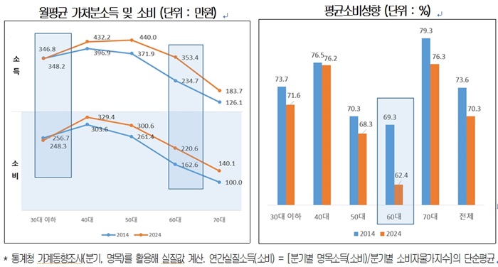 보고서는 통계청 가계동향조사(2014년, 2024년 자료 기준)를 바탕으로 10년 전후 연령대별 소득과 소비지출 및 소비성향 변화를 분석했다. 그 결과 30대 이하를 제외한 모든 세대에서 소득이 늘었음에도 불구하고 소비지출이 비례해 증가하지 않았으며, 평균소비성향은 2014년 대비 2024년에 전체적으로 3.3%p 하락한 것으로 나타났다.