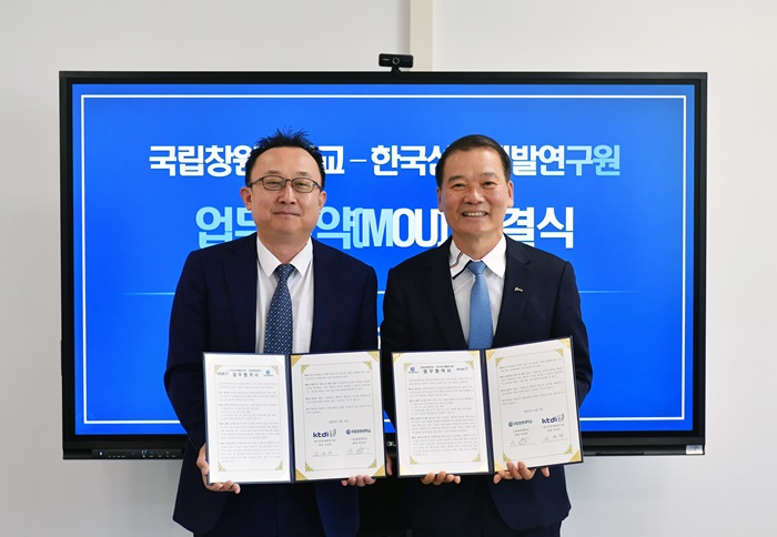 국립창원대학교 박종규 연구산학부총장(왼쪽)과 한국섬유개발연구원 김성만 원장(오른쪽)이 업무협약을 체결한 뒤 기념사진을 찍고 있다.