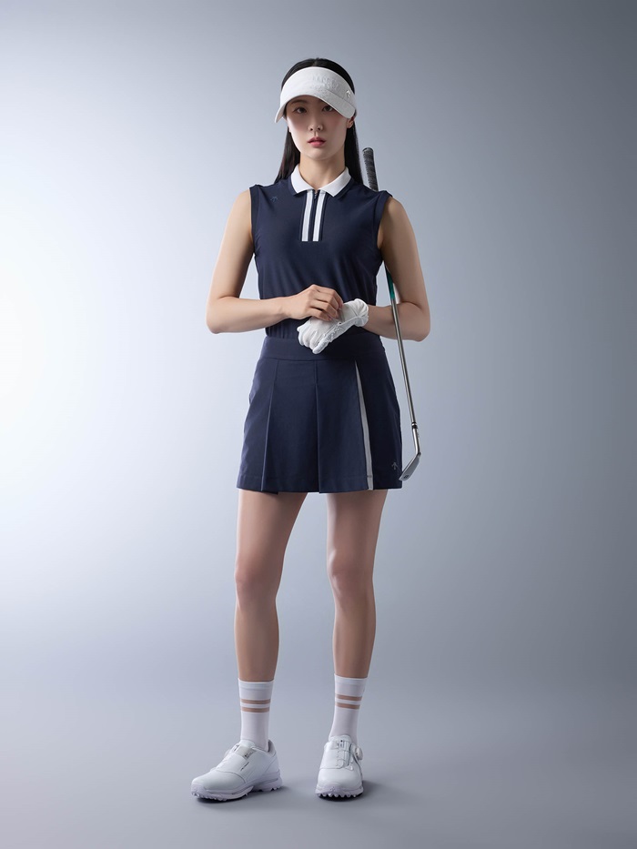 2025 썸머 컬렉션의 여성용 주력 제품인 ‘메쉬 트리코트 슬리브리스’는 에어 툴 소재를 사용해 착용감이 시원한 민소매 디자인이다. 매끈한 조직감에 간결한 로고 포인트로 세련미를 더했다. 앞 지퍼가 있어 착용이 편하고 카라넥과 통일된 앞선 배색으로 깔끔함을 더했다. 소매 끝단에 신축성 좋은 이중조직으로 설계해 들뜨거나 말리지 않는다. 함께 셋업할 수 있는 ‘메쉬 트리코트 큐롯 팬츠’는 앞에서 보면 영락없는 스커트이지만 실제 스커트와 팬츠를 결합한 디자인이라 활동성이 우수하다. 넓은 면적의 밴딩이 허리를 편안하고, 탄탄하게 잡아줘 라운딩 내내 안정감을 제공한다. 넓게 배치한 규칙적인 절개 플리츠가 단정하고, 화이트 컬러 배색으로 포인트를 줬다. 두 제품 모두 컬러는 네이비, 화이트 2가지가 있다.
