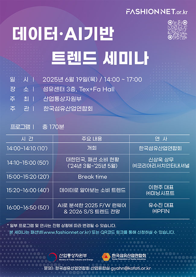 한국섬유산업연합회(회장 최병오, 이하 섬산련)는 데이터·AI기반 정보 제공을 통해 섬유패션기업의 효율적 의사결정을 지원하기 위해 6월 19일(목) 섬유센터에서 업계 300명이 참여하는 '데이터·AI기반 트렌드 세미나'를 개최한다.