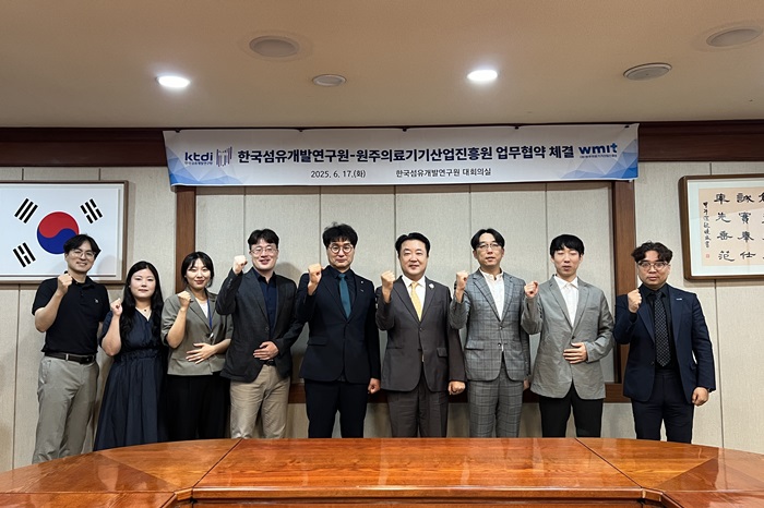한국섬유개발연구원(원장 김성만)과 (재)원주의료기기산업진흥원(원장 한종현)은 17일 한국섬유개발연구원 대회의실에서 의료용 융합소재 연구개발에 대한 양 기관의 공동 연구와 기술 발전 촉진을 위한 업무협약을 체결했다.