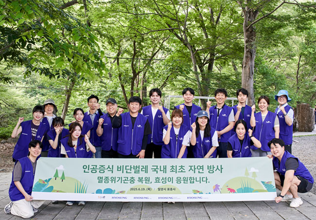 효성이 인공증식한 멸종위기종 비단벌레를 국내 최초로 자연에 방사하며 생태계 복원에 나섰다.