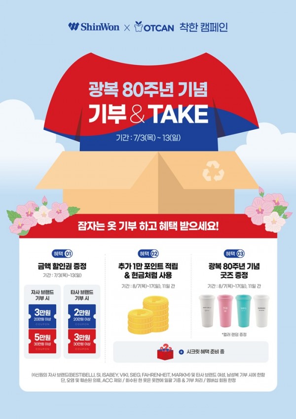 신원이 의류 나눔 비영리 단체 ‘옷캔(OTCAN)’과 오는 3일부터 13일까지 11일간 2025년 하반기 헌 옷 기부 캠페인 ‘기부 & TAKE’를 진행한다고 1일 밝혔다. 이번 캠페인은 대한민국 광복 80주년을 기념해 역사적 의미를 되새기고, 일상 속 나눔 가치를 실현하기 위해 다시 한 번 기획됐다.