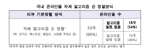조사 결과, 온라인몰 50개 중 33개(66%)는 리뷰를 인기순·랭킹순·베스트순 등 자체 알고리즘 방식으로 기본 정렬하여 표시했으며, 이 중 절반 이상인 18개(54%)는 알고리즘 기준이 공개되지 않았다.