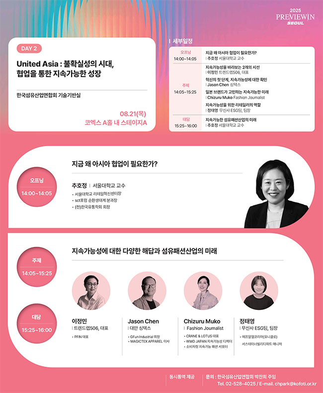 한국섬유산업연합회(회장 최병오, 이하 ‘섬산련’)는 오는 21일(목), 서울 코엑스 A홀 Stage A에서 열리는 ‘프리뷰 인 서울(PIS) 2025’의 부대행사로, 글로벌 섬유패션 산업의 지속가능 전략을 다루는 특별 포럼 'United Asia: 불확실성의 시대, 협업을 통한 지속가능한 성장'을 개최한다.