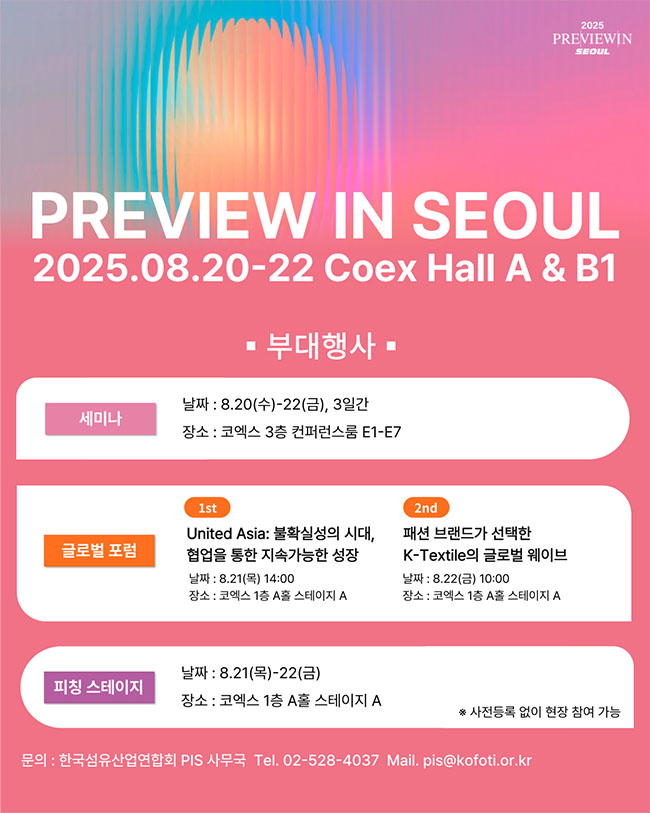 한국섬유산업연합회(회장 최병오, 이하 섬산련)가 오는 20일부터 22일까지 코엑스 A, B1홀에서 개최하는 ‘프리뷰 인 서울 2025(이하 PIS)'는 예년보다 다채로운 부대행사를 마련해 섬유패션인들의 소통과 축제의 장으로 꾸며질 예정이다.