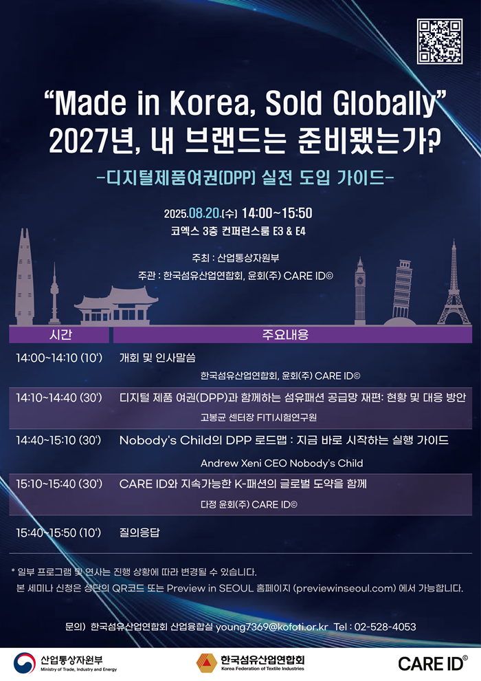 한국섬유산업연합회(회장 최병오, 이하 섬산련)는 오는 8월 20일 오후 2시 코엑스 3층 컨퍼런스룸 E3&E4에서 ‘Made in Korea, Sold Globally - 2027년, 내 브랜드는 준비됐는가?’를 주제로 디지털제품여권(Digital Product Passport, DPP) 실전 도입 가이드 세미나를 개최한다.