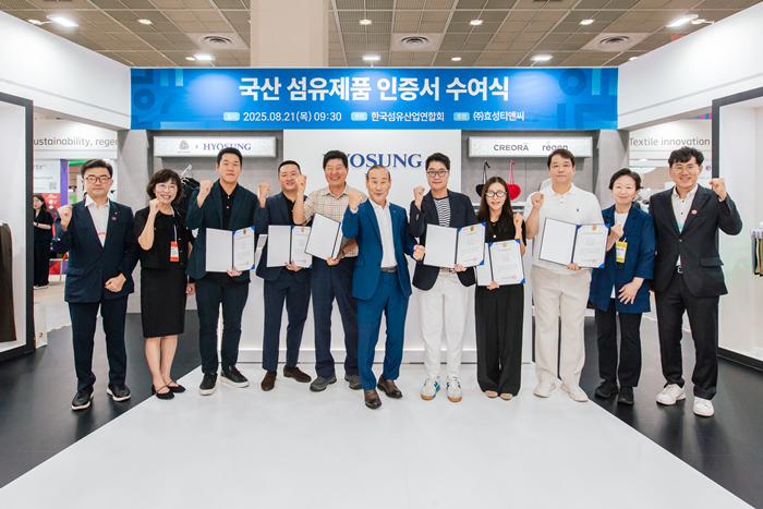 한국섬유산업연합회(회장 최병오, 이하 섬산련)는 지난 21일 서울 코엑스에서 열린 ‘프리뷰 인 서울(Preview in Seoul, PIS) 2025’ 전시회에서 국산 섬유제품 인증서 수여식을 개최했다.