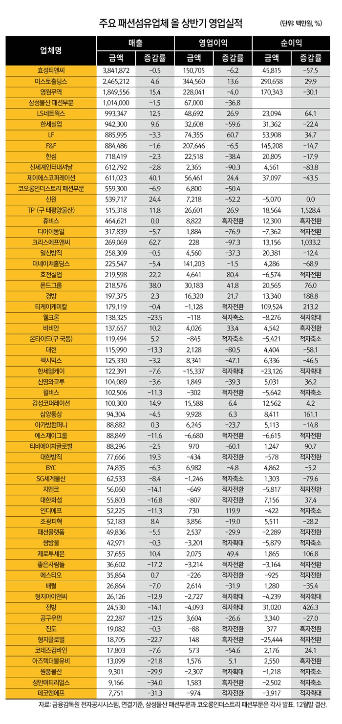 반면 글로벌 패션 업체인 미스토홀딩스와 비상장사인 이랜드월드의 실적은 호조를 보였다.