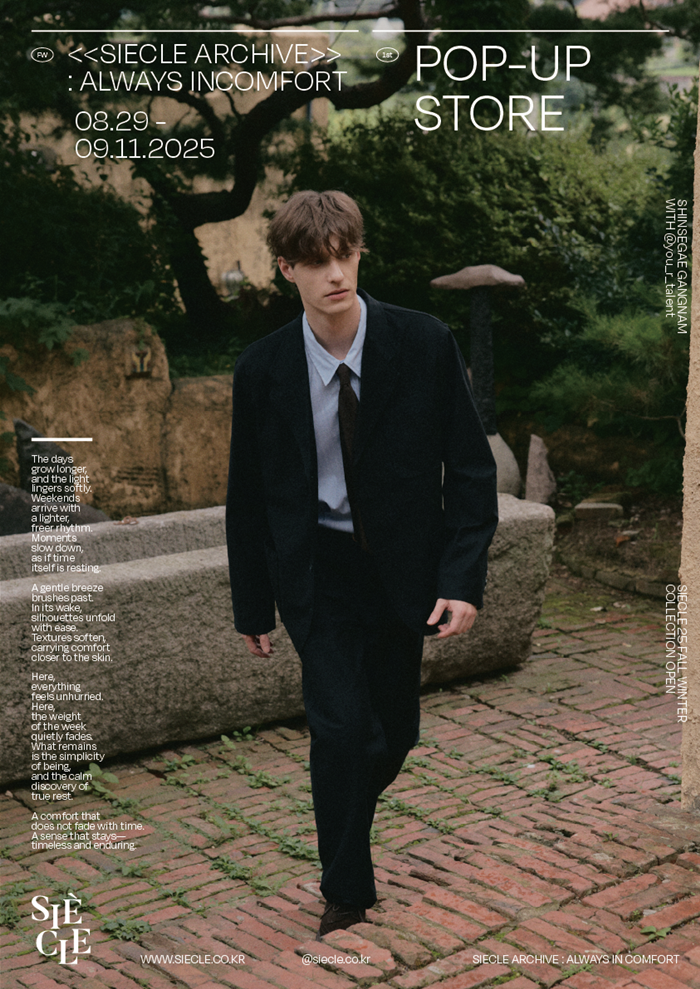 시에클은 8월 29일부터 9월 11일까지 2주간 신세계 백화점 강남점 8층 보이드존에서 팝업스토어 〈SIECLE ARCHIVE : Always in Comfort〉를 운영한다.