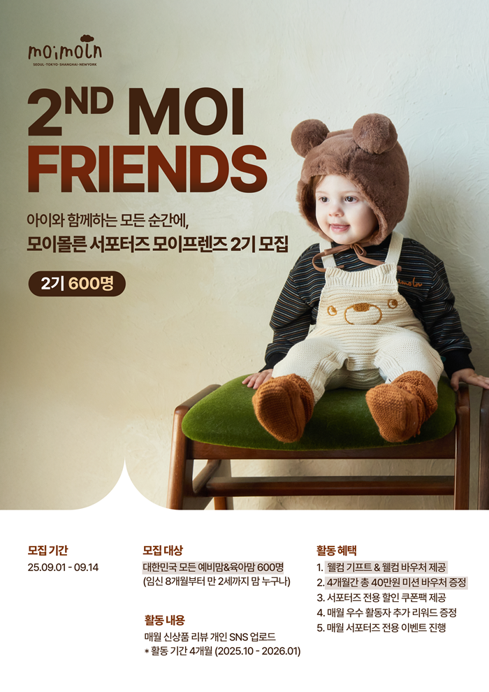 한세엠케이(각자대표 김지원, 임동환)가 전개하는 글로벌 베이비웨어 브랜드 ‘모이몰른’이 대규모 서포터즈 ‘모이프렌즈’ 2기를 모집한다.