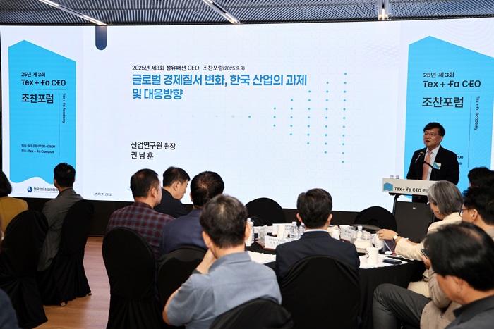 이번 조찬포럼은 권남훈 산업연구원 원장이 ‘글로벌 경제질서 변화, 한국 산업의 과제 및 대응방향’을 주제로, 최근 국제정세 변화를 바탕으로 섬유패션산업계의 경쟁력 확보를 위한 미래 전략을 모색하는 자리로 마련됐다.