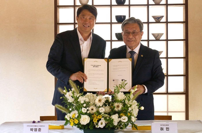 지난 15일 서울 종로구 창덕궁에서 열린 국가유산 보존 및 대중화 위한 협약식에서 박영준 더네이쳐홀딩스 대표(왼쪽)와 허민 국가유산청 청장이 기념 촬영을 하고 있다.