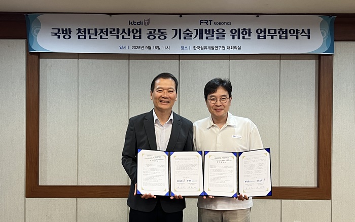 한국섬유개발연구원(원장 김성만, 이하 KTDI)과 ㈜에프알티로보틱스(대표 장재호)는 16일, KTDI 대회의실에서 국방 첨단전략산업 분야 공동 기술개발을 위한 업무협약(MOU)을 체결했다.
