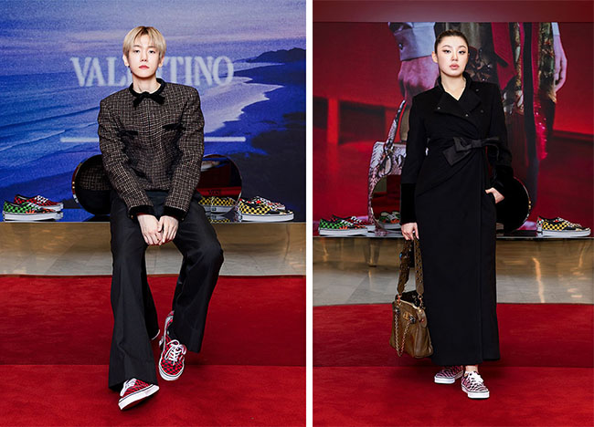 리정은 패디드 숄더, 벨벳 디테일, 파유(faille) 보우 클로저가 돋보이는 블랙 드레이프 코트로 강렬한 룩을 선보였다. 발렌티노 가라바니와 반스의 협업으로 선보이는 스니커즈에 메종의 새로운 액세서리인 발렌티노 가라바니 판테아 백을 매치해 개성을 드러냈다.