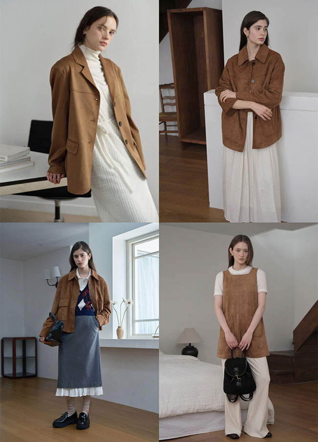 이번 시즌 쥬시쥬디는 ‘URBAN HARMONY’를 주제로, 클래식한 실루엣에 도회적인 감각을 더한 스타일링을 제안한다. 특히 빈티지한 무드와 고급스러움을 동시에 지닌 스웨이드(Suede)를 메인 소재로 선보인다. 가벼우면서 포근한 착용감과 깊이 있는 색감으로 간절기부터 초겨울까지 폭넓게 스타일링하기 좋다.