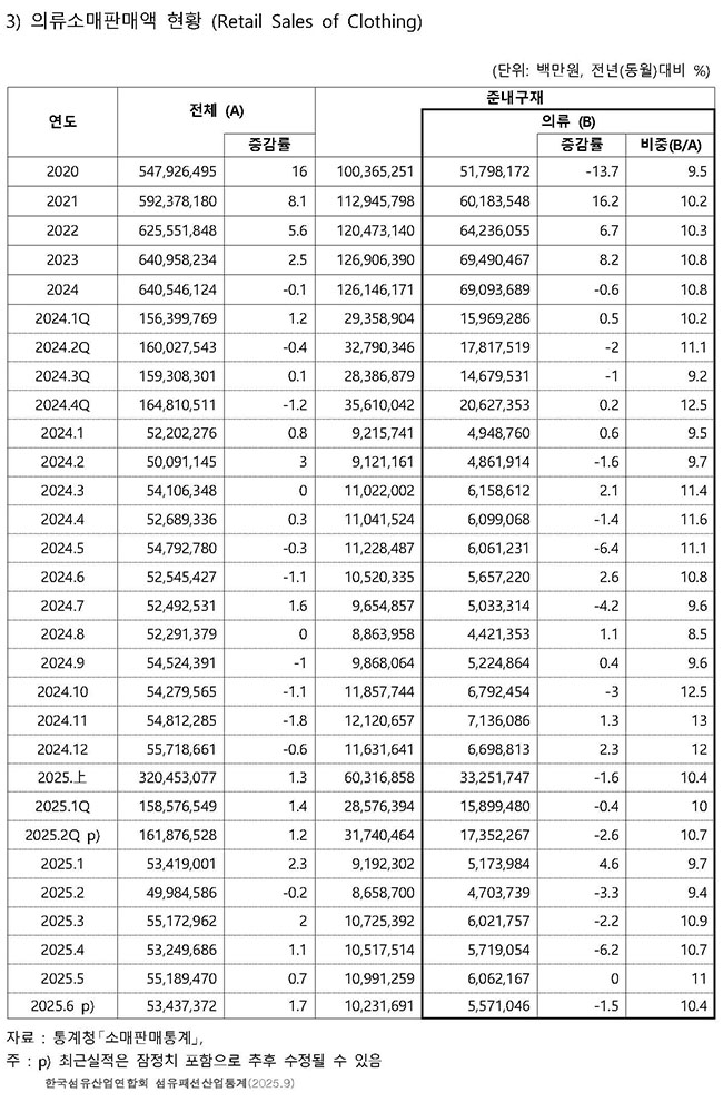 ‘섬유패션산업 통계자료집(2025 상반기)’은 한국섬유산업연합회 홈페이지를 통해 누구나 열람할 수 있다.