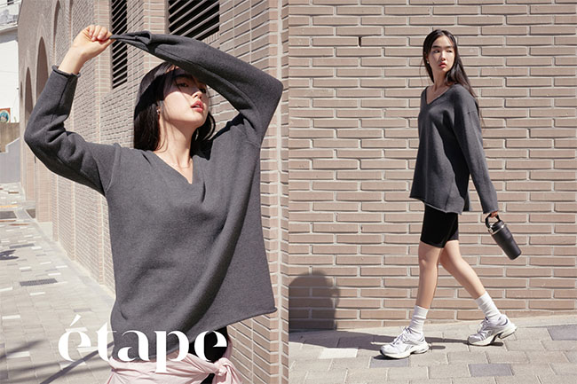 에타페 원마일웨어는 이전 시즌보다 한층 더 부드럽고 여유로운 실루엣, 그리고 캐주얼한 무드로 완성됐고, 니트 베스트, 니트 스웻 셔츠, 클래식한 스웻 셔츠, 셋업으로 구성 가능한 스웻팬츠, 니트 스커트 등 다양한 아이템은 단품으로도 스타일링이 가능하며, 서로를 믹스매치하거나 셋업으로도 자연스럽게 연출할 수 있다. 아이템 간 조합이 자유로운 구성은 에타페가 지향하는 실용적이면서도 감각적인 에센셜웨어의 매력을 한층 더 확장시킨다.