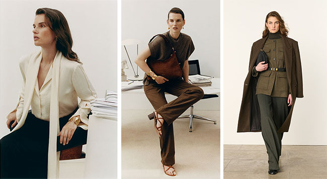 드레시한 무드를 더하는 광택 있는 실크 제품도 눈길을 끈다. 브이넥 블라우스에는 목에 두를 수 있는 리본 디테일을 더해 관능적인 매력을 표현했으며, 블라우스와 팬츠 셋업 아이템은 드레이핑 처리로 부드럽게 흐르는 실루엣을 구현했다.