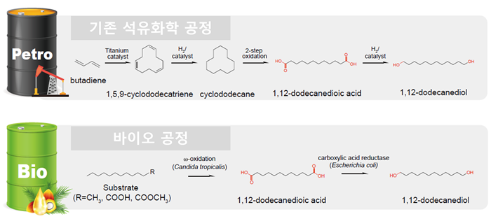 기존 석유화학 공정(위)과 바이오 공정(아래)을 통한 지방족 폴리에스터 원료 제조공정 비교