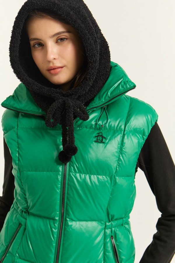 여성용 ‘글로시 다운 베스트’는 광택이 있는 나일론 원단을 사용해 감각적이며, 살짝 곡선 설계한 절개 라인이 날씬해 보이는 효과를 제공한다. 원단 자체에 물방울을 튕기는 발수 기능이 탑재돼 있어 가벼운 눈, 비 등 생활 방수 효과도 있다. 힙을 살짝 덮는 기장이라 체형에 신경 쓸 필요 없이, 오직 플레이에만 집중할 수 있다. 네크라인과 허리 부분 스트링을 조이거나 풀어 취향 것 스타일링 연출이 가능하고, 목 안쪽에 부드럽고 포근한 플리스 소재와 무소음 방풍 안감을 적용해 보온성을 강화했다. 전면 포켓에 지퍼를 달아 안전한 수납이 가능하다. 컬러는 그린, 블랙 등 총 2가지가 있다.
