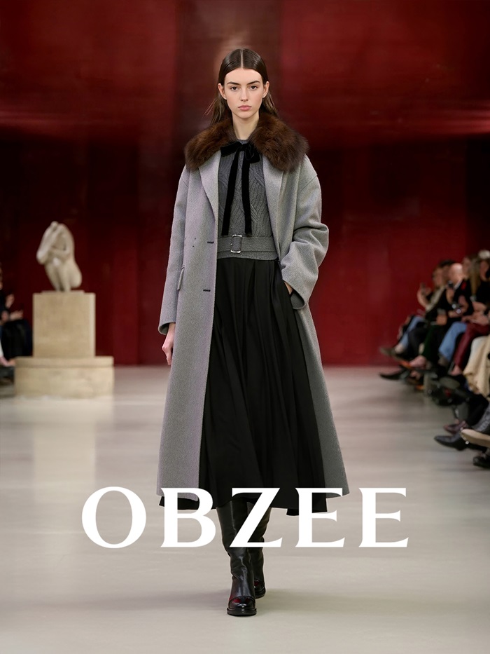 퍼와 아우터의 믹스 매치로 완성된 럭셔리 룩을 중심으로, 브라운·머스터드·그레이·네이비 등 깊이 있는 컬러 팔레트를 활용해 클래식한 무드 속에서도 오브제 특유의 정제된 페미닌 감성을 담아냈다. 또한 볼륨감 있는 퍼 카라 디테일, 구조적인 실루엣, 질감이 살아있는 울과 레더 소재의 조합은 런웨이 룩의 완성도를 극대화하며, 오브제만의 아우터 디자인 미학을 한층 강화했다.