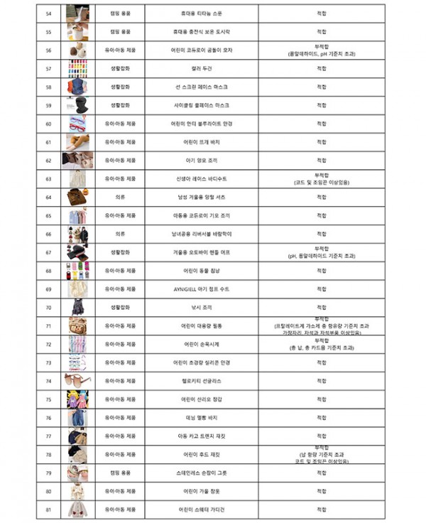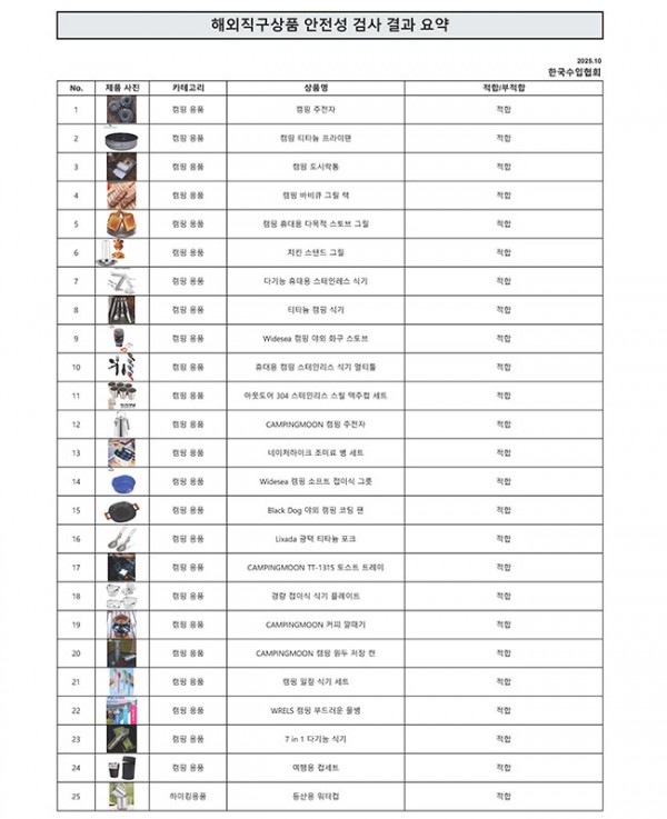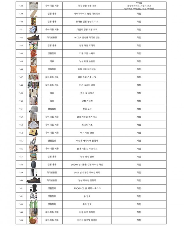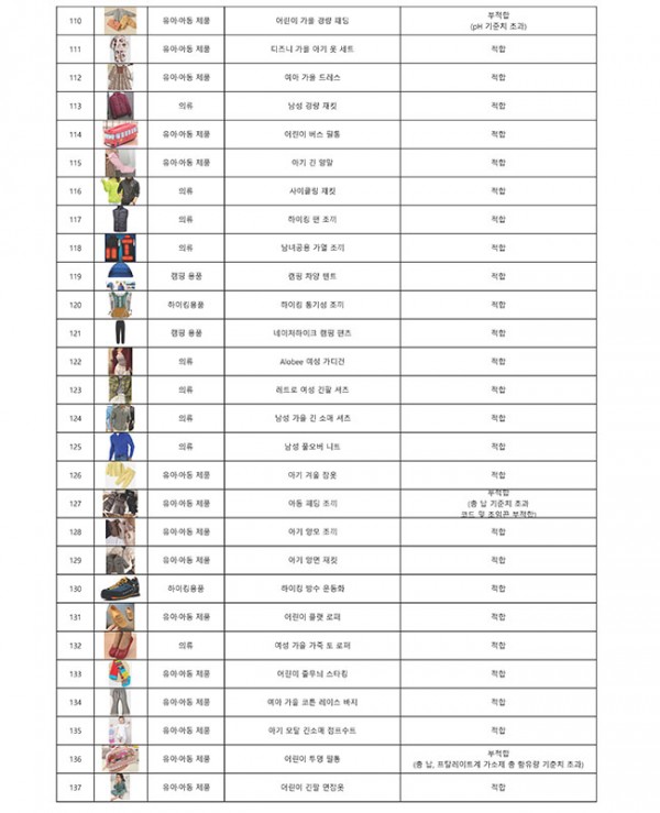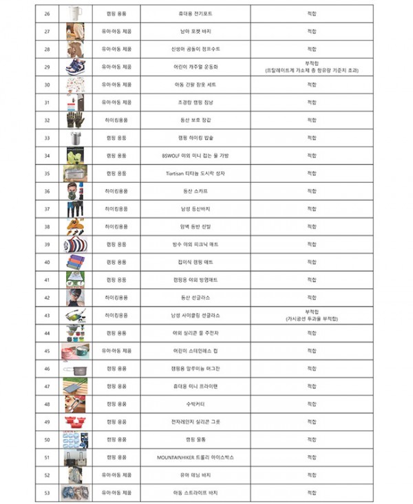 이번 검사 대상은 캠핑, 하이킹 용품을 비롯한 어린이 가을 의류 등 가을 시즌 제품과 할로윈 제품이 중심이었으며, 협회는 국내 안전기준에 부합하지 않는 제품에 대해서는 유통 차단 조치를 완료했다고 밝혔다.