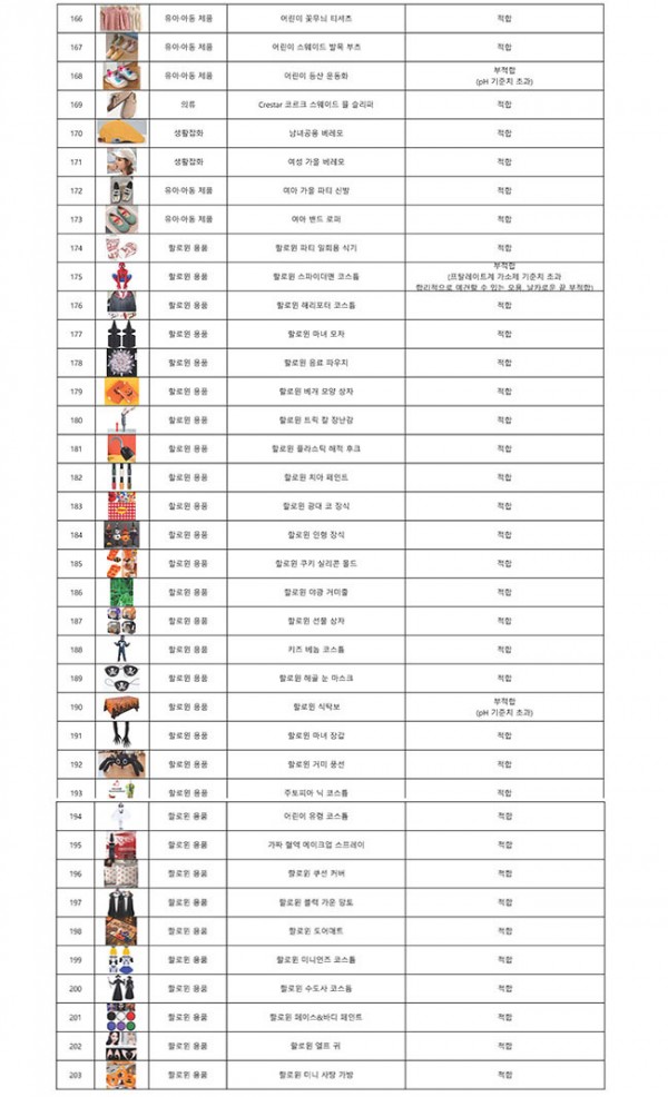 총 203개 품목을 검사한 결과, 187개 제품(92.2%)이 국내 안전기준을 충족한 반면, 16개 품목(7.8%)은 기준에 미달한 것으로 나타났다. 이 중 할로윈 관련 제품은 총 30개로, 그 중 2개 제품이 부적합 판정을 받아 전반적으로 양호한 결과를 보였다.