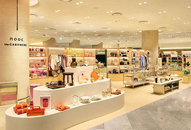 이번 신세계 센텀시티점은 누크 더캐시미어의 첫 지방 정규 매장으로, 차별화된 감성의 편집 스토어로 구성됐다. 컬러로 구분된 공간을 통해 테이블웨어, 시계, 라운지웨어, 슈즈 등 다양한 아이템을 감각적으로 제안했으며, 리빙층이 아닌 패션층(3층)에 위치해 패션과 라이프스타일을 아우르는 새로운 경험을 제공했다. 특히 월 별로 컬러 테마에 맞춰 변경되는 디스플레이 존은 매달 새로운 볼거리를 제공한다.