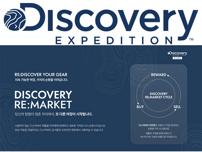 프리미엄 라이프스타일 아웃도어 브랜드 ‘디스커버리 익스페디션’(이하 ‘디스커버리’)이 중고 거래 플랫폼 ‘디스커버리 리마켓(Discovery Re:Market)’을 공식 오픈한다고 밝혔다.