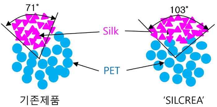 기존제품(좌)과 실크/PET 복합소재인 SILCREA(우)의 단면 모식도 비교