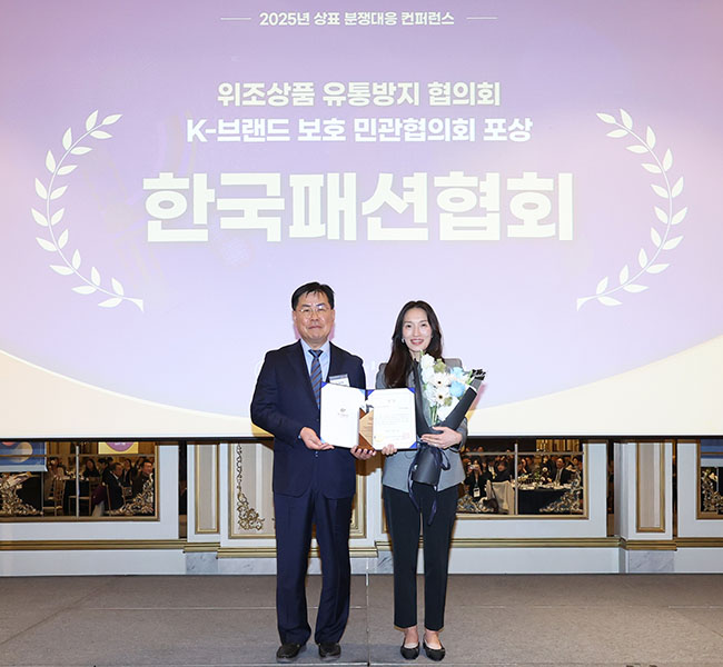 한국패션협회(회장 성래은)가 운영하는 패션IP센터가 지식재산처 주최, 한국지식재산보호원 주관으로 열린 2025 상표 분쟁대응 컨퍼런스 에서 “한국지식재산보호원장상”을 수상했다.