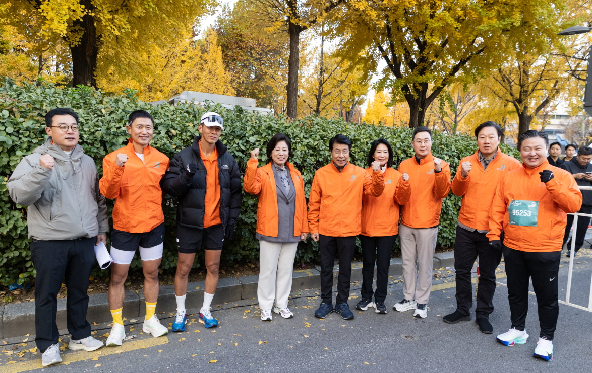 형지엘리트 ‘윌비플레이’가 ‘2025 MBN 서울마라톤’ 대회 공식 스폰서로 참여했다. 사진은 대회 시작을 앞두고 최준호 형지엘리트 대표(오른쪽 첫 번째)를 비롯해 왼쪽부터 박진성 MBN 상무, 이영표, 션, 남인순 국회의원, 서강석 송파구청장, 김나미 대한체육회 사무총장, 장승준 매경미디어그룹 부회장, 박수민 국회의원이 함께 파이팅을 외치는 모습 / 사진 MBN 제공