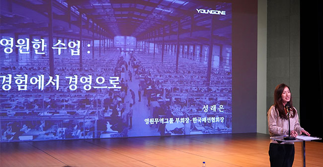 부산섬유패션산업연합회(회장 이성근)는 지난 25일에 부산패션비즈센터 컨벤션 홀에서 노스페이스 브랜드로 유명한 영원무역그룹 성래은 부회장을 명사로 초청 세미나를 성황리에 개최하였다. 이번 강연은 부산지역 패션전공 대학생, 신진 디자이너, 예비 창업자 등을 대상으로‘영원한 수업, 경험에서 경영으로'라는 주제로 진행되었다.