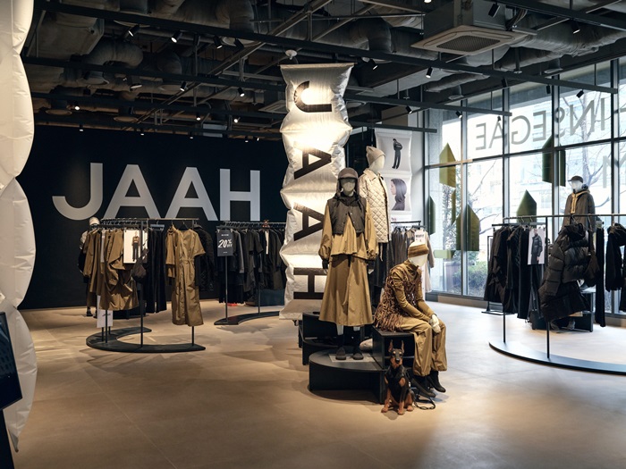 팝업스토어는 겨울 시즌 주력 제품인 하이넥 푸퍼 다운 재킷과 패딩 포켓 숄에서 영감을 받은 패딩 느낌의 조형물을 매장 곳곳에 배치했다. 신규 브랜드인 만큼 조형물에 JAAH라는 브랜드명을 넣어 방문객들이 즉각적으로 브랜드를 인지할 수 있도록 했다.
