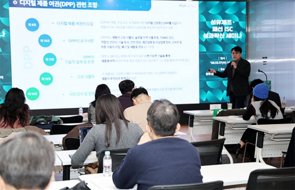이어서 글로벌 규제 대응을 위한 해법으로 켐셈 추미경 대표는 ‘글로벌 ESG 인증 요구 변화’를, FITI 시험연구원 고봉균 센터장은 ‘에코디자인·DPP대응 실천 전략’을 발표하며 친환경 규제 대응과 제품개발 연계의 중요성 및 구체적인 실행 방안을 제시하였다