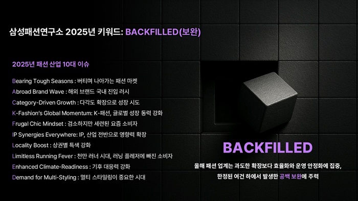 삼성물산 패션부문이 운영하는 삼성패션연구소는 올해의 키워드를 ‘BACKFILLED(보완)’으로 정하고, 2025년 우리나라 패션 산업의 10대 이슈를 18일 공개했다.