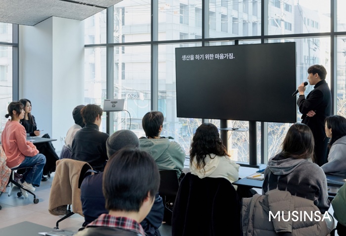 지난 12월 19일 무신사 성수 N1에서 패션 브랜드 ‘미세키서울’ 담당자가 MNFS(무신사 넥스트 패션 스콜라십) 장학생들을 대상으로 강연하는 모습