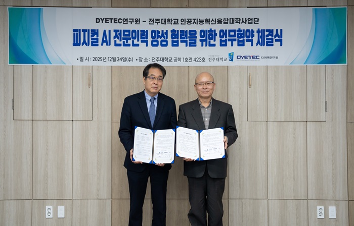 다이텍연구원(원장 최재홍)은 지난 24일 전주대학교 인공지능혁신융합대학사업단(단장 고선우)과 ‘피지컬 AI 기반 물리 환경 시뮬레이션·실증 전문인력 양성’을 위한 업무협약(MOU)을 체결했다.