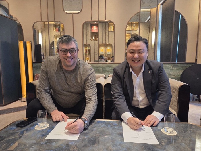 패션그룹형지를 총괄하고 있는 최준호 부회장(오른쪽)이 오프체인랩스 AJ 워너 최고전략책임자(CSO, 왼쪽)와 스테이블코인 기반 디지털 결제 인프라 개발 협력을 위한 MOU를 체결하고 있다.