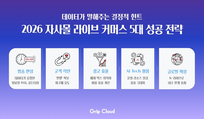 그립 클라우드는 내부 데이터를 토대로 지난해 시장을 분석하고, 2026년 자사몰 라이브 커머스 전략으로 ▲방송 편성(Scheduling) ▲고객 락인 구조(Lock-in) ▲광고 효율화(AD Strategy) ▲기술 활용(New Tech) ▲글로벌 시장 확장(Global Market) 등 5가지를 제시했다.