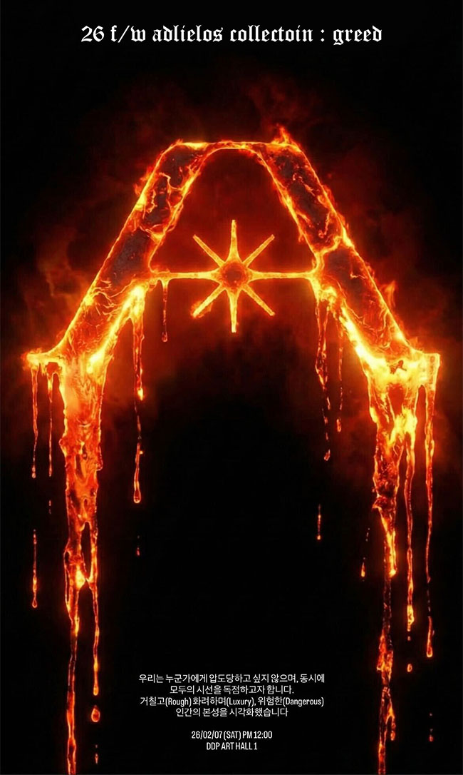 럭셔리 스트리트 브랜드 에드리엘로스(ADLIELOS)가 오는 7일 토요일, 서울 동대문디자인플라자(DDP) 아트홀 1관에서 2026 F/W 컬렉션 ‘탐욕(GREED)’을 공개한다. 이번 컬렉션은 에드리엘로스가 지속적으로 탐구해온 ‘욕망의 시각화’를 가장 집약적인 형태로 풀어낸 무대가 될 예정이다.
