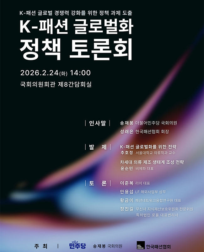 한국패션협회(회장 성래은)와 더불어민주당 송재봉 국회의원은 오는 24일(화) 오후 2시, 국회의원회관 제8간담회실에서 'K-패션 글로벌화 정책 토론회'를 개최한다.